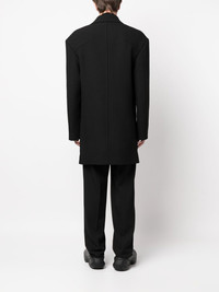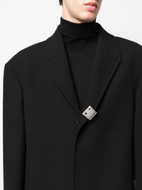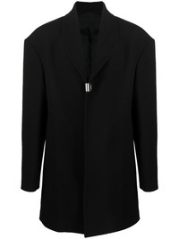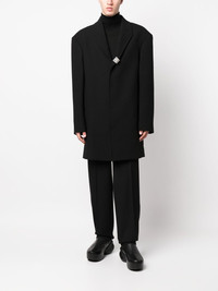 single-breasted coat black cotton-wool blend notched lapels oversized shoulders long sleeves mid-length Made in Italy Composition Outer: Polyamide 37%, Polyester 33%, Wool 27%, Spandex/Elastane 3% Lining: Cotton 100%, Cupro 100% SIZE & FIT Model measurements Height 6 ft 2 in(1.87 m) Bust/Chest 35.82 in(91 cm) Hips 35.43 in(90 cm) Waist 27.95 in(71 cm) FittingInformation This piece fits true to size. We recommend you get your regular size Cut for a loose fit Made with a mid-weight fabric Washing instructions Dry Clean Only