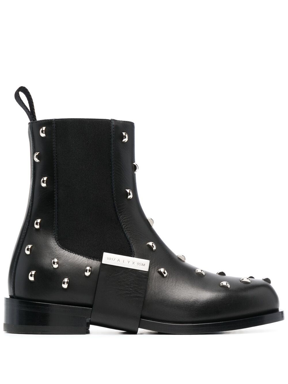 studded Chelsea boots black leather stud detail pull-tab at the heel elasticated side panels round toe low block heel Made in Italy Composition Outer: Leather 100% Lining: Leather 100% Sole: Rubber 100%, Leather 100% SIZE & FIT Measurement HEEL 1.57 in(4 cm) HEIGHT 6.69 in(17 cm) Sole height 0.78 in(2 cm)
