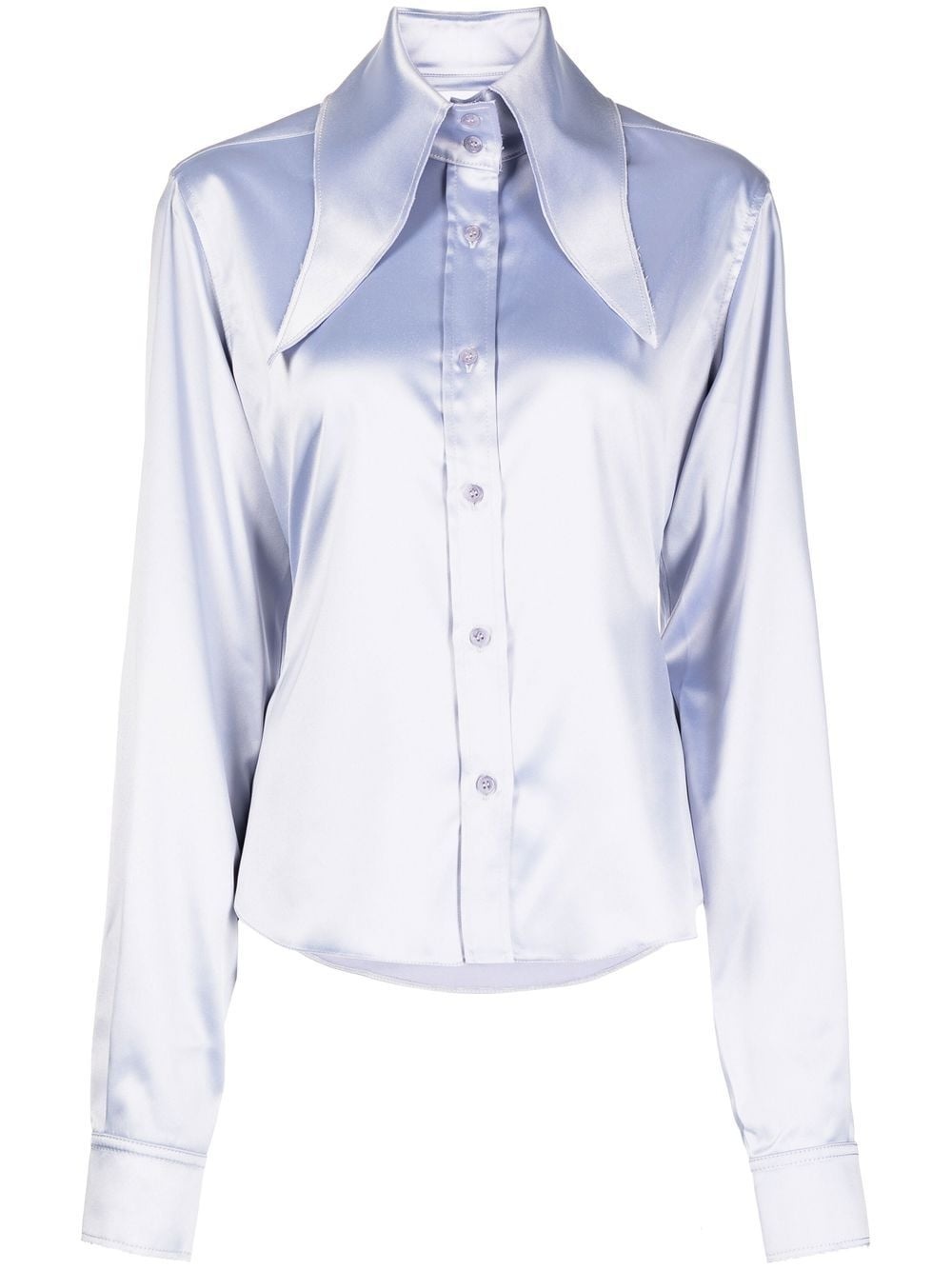 Ione oversize-collar shirt lavender purple oversized pointed collar front button fastening long sleeves buttoned cuffs curved hem Made in United Kingdom Composition Body: Polyester 97%, Spandex/Elastane 3% SIZE & FIT Model measurements Height 5 ft 9 in(1.74 m) Bust/Chest 31.49 in(80 cm) Hips 35.43 in(90 cm) Waist 24.8 in(63 cm)