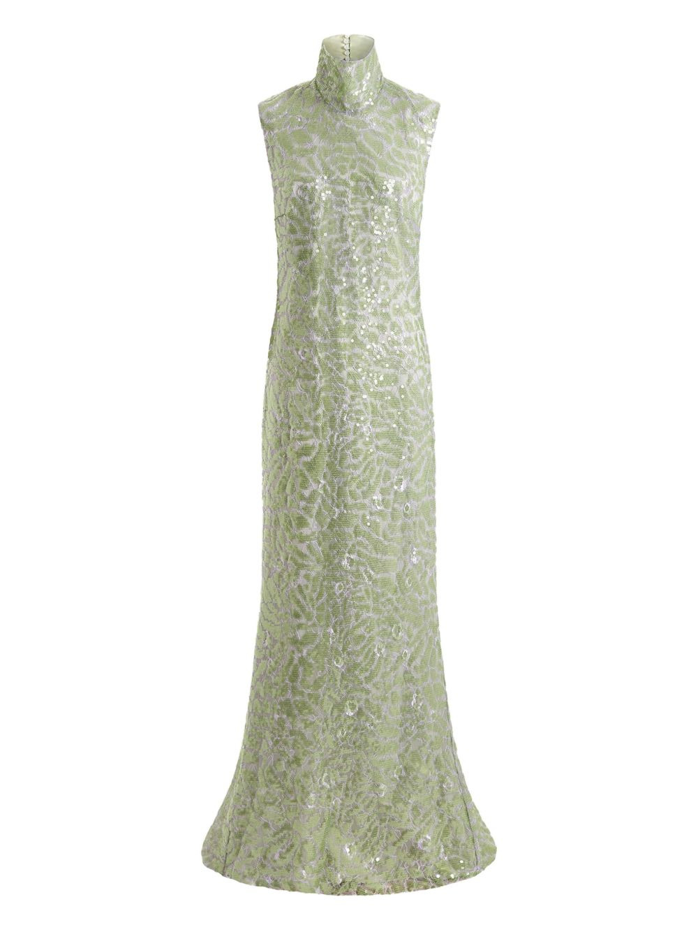 Zegli lace sequinned gown Highlights - Light green - Sequin embellishment - Sleeveless - High neck - Open back - Fishtail hem Made in United Kingdom Composition Outer: Polyester 100% Lining: Recycled Polyester 100% Washing instructions Read Manufacturer Guidelines