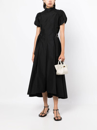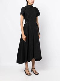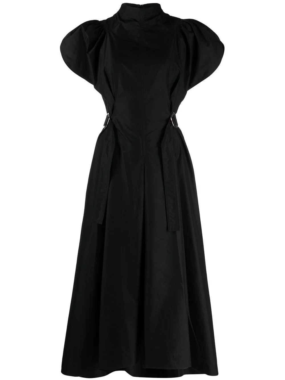 high-neck flared midi dress black cotton blend gathered detailing pleat detailing high neck short slit sleeves rear zip fastening adjustable waist strap flared design high-low hem Imported Composition Cotton 70%, Polyester 30% SIZE & FIT Model measurements Height 5 ft 10 in(1.77 m) Bust/Chest 31.49 in(80 cm) Hips 35.43 in(90 cm) Waist 25.19 in(64 cm) FittingInformation Designed for a close fit at the chest and waist with a loose fit at the hip Made from a midweight non-stretch fabric Washing instructions Machine Wash