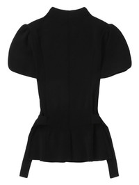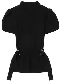 mock-neck top Highlights - Black - Adjustable side straps - Short puff sleeves - Fitted waistline - Straight hem Imported Composition Rayon 63%, Nylon 37%