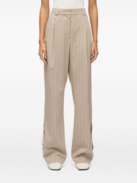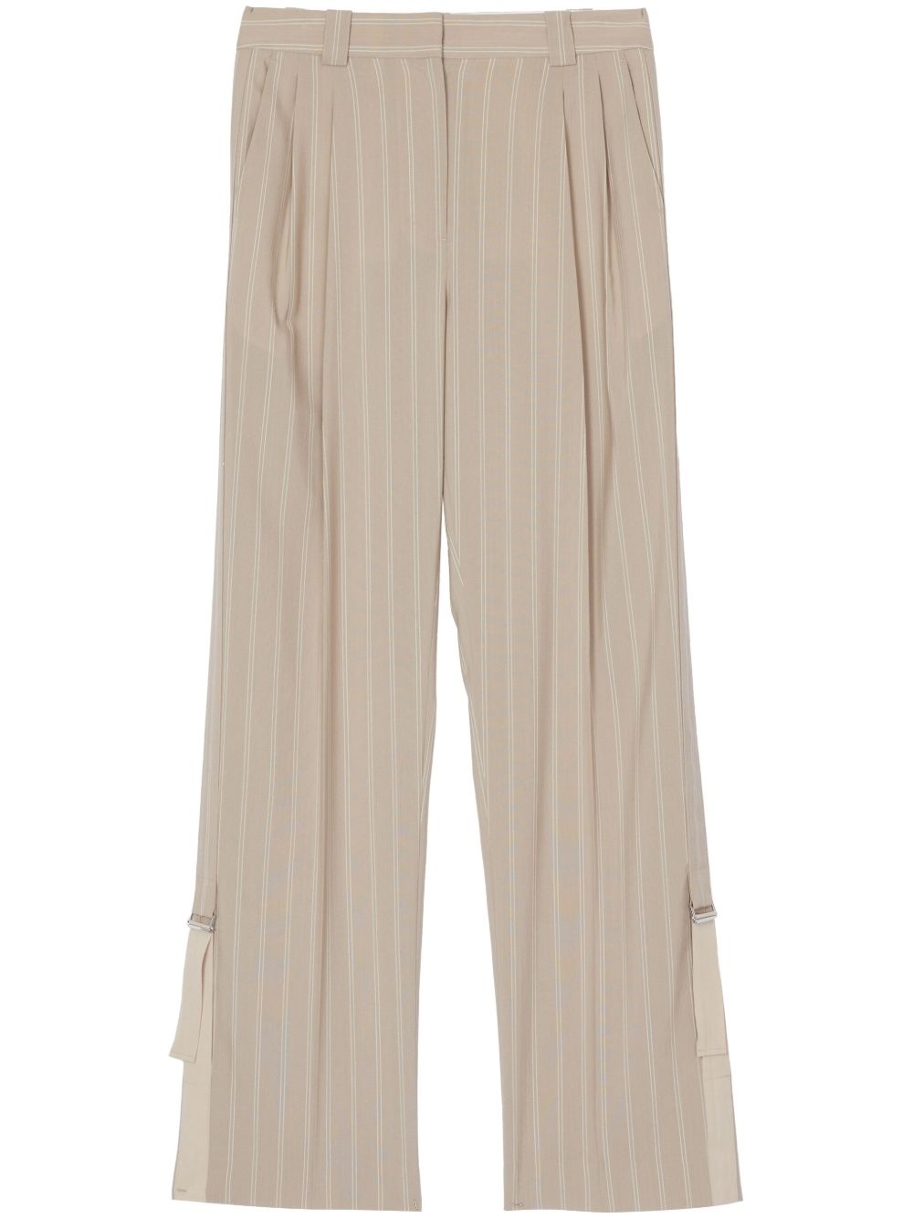 pinstripe-pattern trousers Highlights - Almond beige - Concealed front fastening - Two side slash pockets - Two rear jetted pockets - Belt loops Imported Composition Viscose 46%, Fabric 31%, Wool 23%