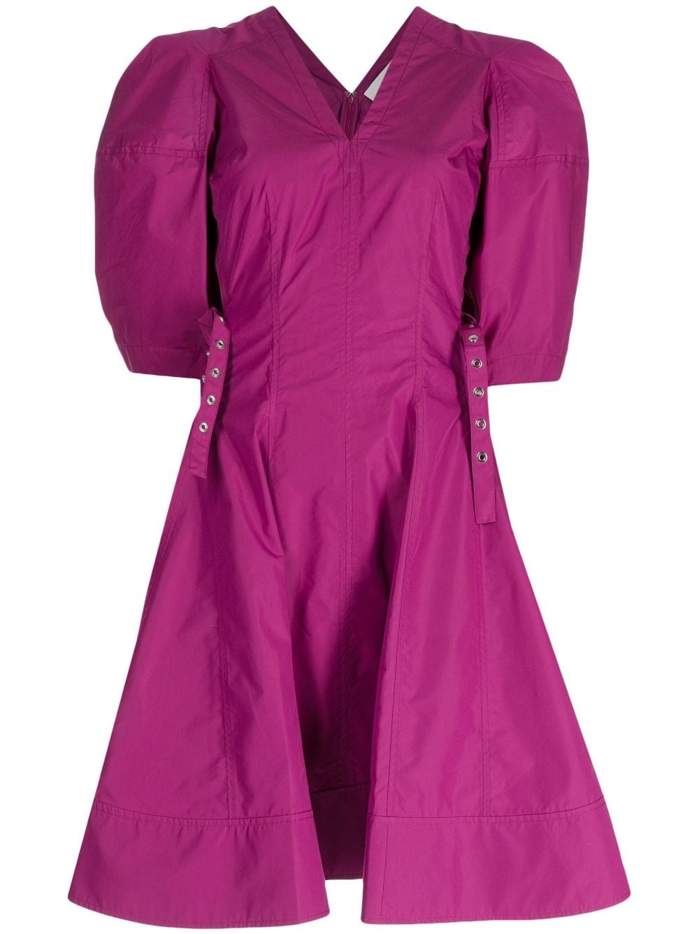 puff-sleeve V-neck godet dress