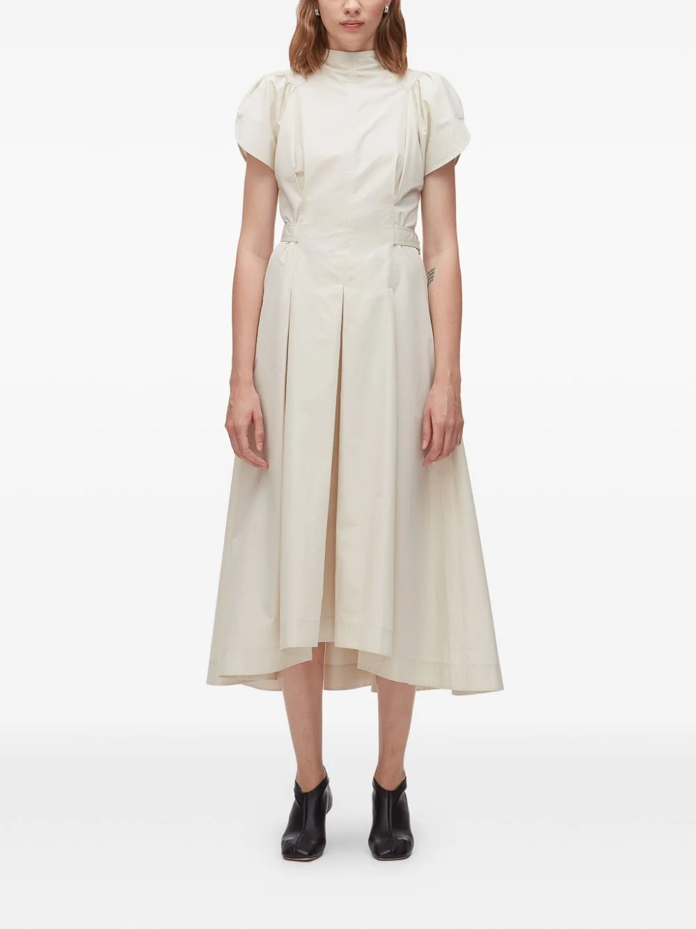puff-sleeves pleated midi dress Highlights - Stone - Mock neck - Short sleeves - Buckle belt - Pleated detail - A-line skirt Imported Composition Cotton 70%, Polyester 30% Washing instructions Read Manufacturer Guidelines