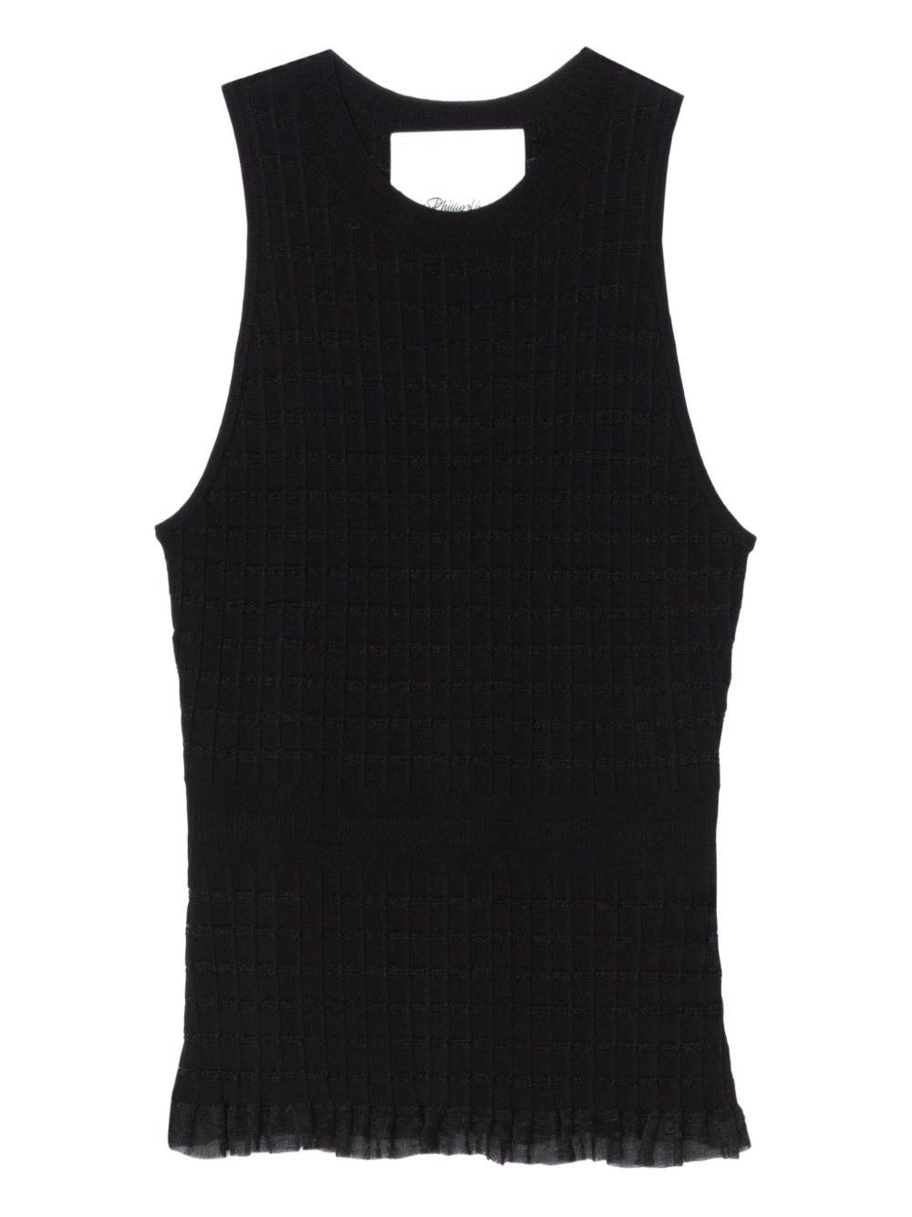ribbed-knit ruffled top Highlights - Black - Ribbed - Sleeveless - Round neck - Fitted bodice - Ruffled hem Imported Composition Viscose 67%, Nylon 30%, Polyester 3% Washing instructions Dry Clean Only