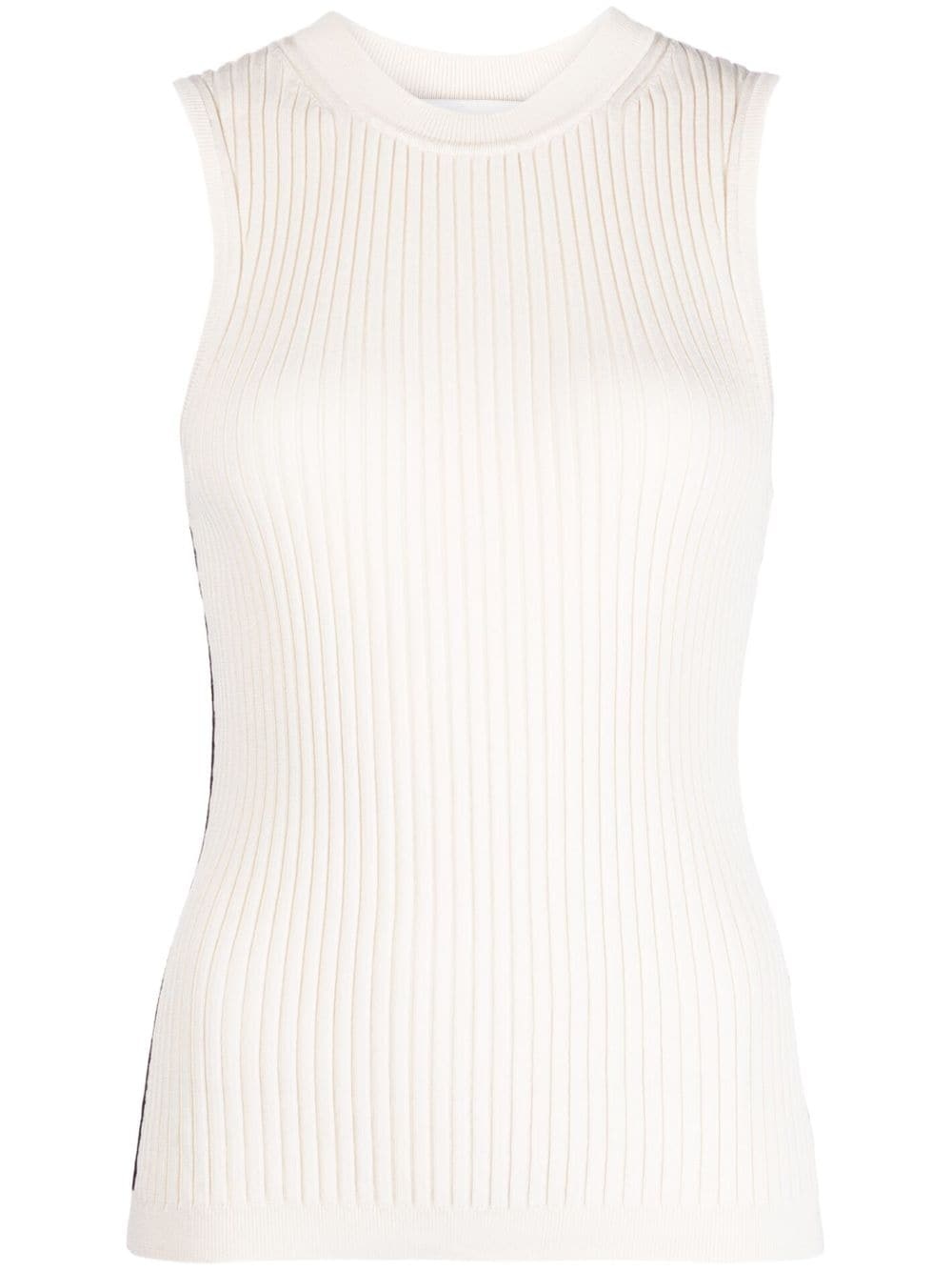 sleeveless ribbed-knit top Highlights - Ivory white/jet black - Knitted construction - Ribbed knit - Crew neck - Sleeveless - Straight hem Imported Composition Viscose 58%, Cotton 26%, Polyamide 14%, Elastane 2% SIZE & FIT Model measurements Height 5 ft 11 in(1.8 m) Bust/Chest 28.34 in(72 cm) Hips 35.43 in(90 cm) Waist 23.62 in(60 cm) FittingInformation Designed for a slim fit that sits just away from the body offering a close yet comfortable fit Made with a midweight knit, this piece offers some stretch This piece fits true to size – take your usual size Washing instructions Dry Clean Only