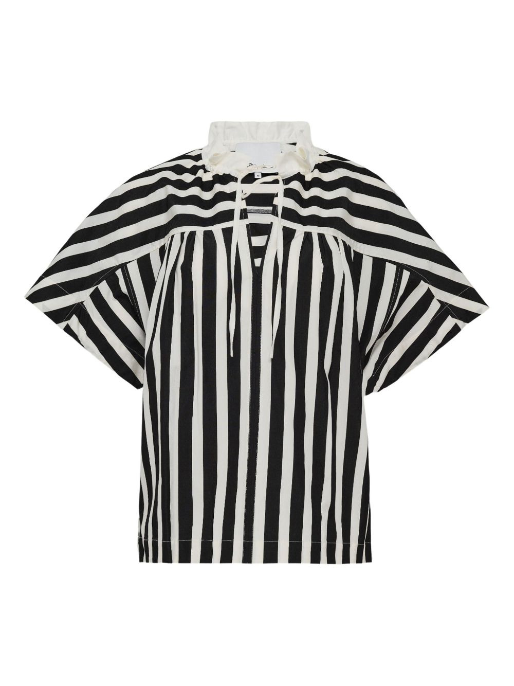 striped frill-neck top Highlights - Black and white - Vertical stripes - Frilled neckline - Tie fastening - Short sleeves - Straight hem Imported Composition Cotton 91%, Silk 9% Washing instructions Read Manufacturer Guidelines