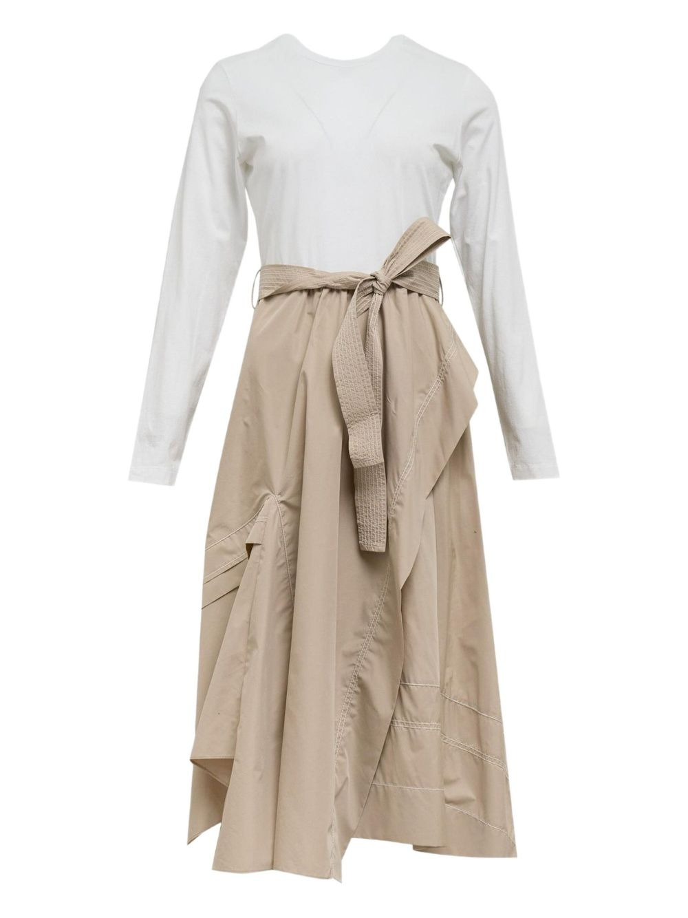 tie-waist panelled midi dress Highlights - White/beige - V-neck - Long sleeves - Panelled construction - Asymmetric hem Imported Composition Cotton 70%, Polyester 30% Washing instructions Read Manufacturer Guidelines