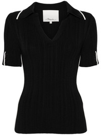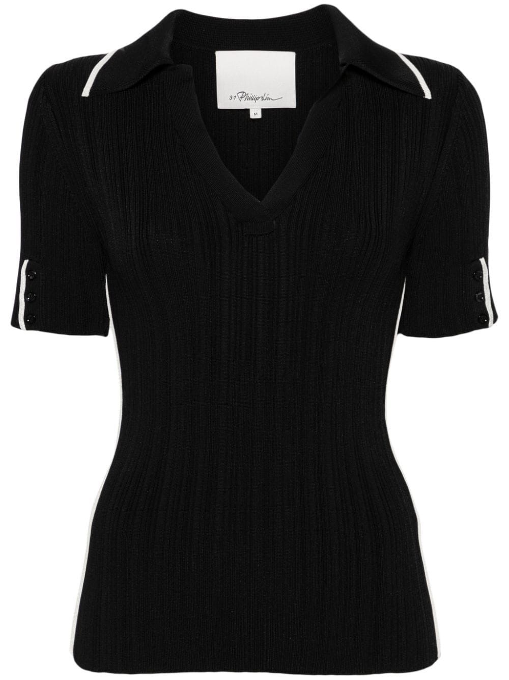 V-neck ribbed polo shirt Highlights - Black/white - Ribbed knit - Side stripe detailing - Polo collar - V-neck - Short sleeves with buttoned cuffs - Lettuce hem Imported Composition Viscose 73%, Polyester 16%, Polyamide 11%