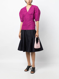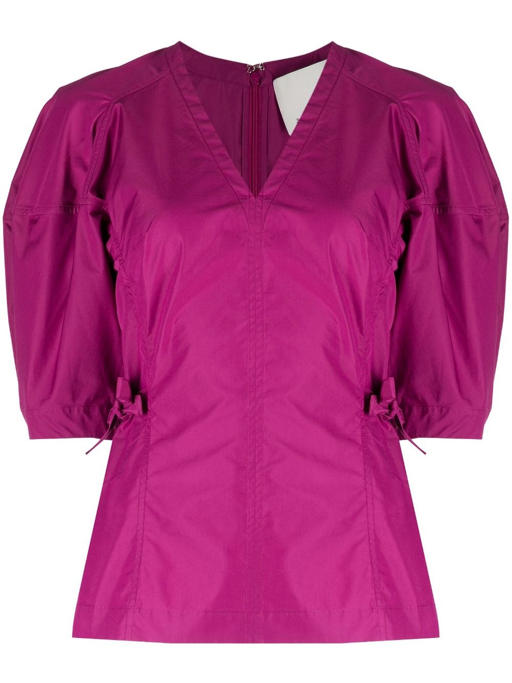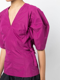 V-neck short-sleeve top Highlights - Mulberry purple - Cotton blend - V-neck - Rear zip fastening - Short puff sleeves - Straight hem Imported Composition Cotton 70%, Polyester 30% SIZE & FIT Model measurements Height 5 ft 10 in(1.77 m) Bust/Chest 31.49 in(80 cm) Hips 35.43 in(90 cm) Waist 25.19 in(64 cm) FittingInformation Designed for a slim fit that sits just away from the body offering a close yet comfortable fit Made from a midweight non-stretch fabric This piece fits true to size – take your usual size