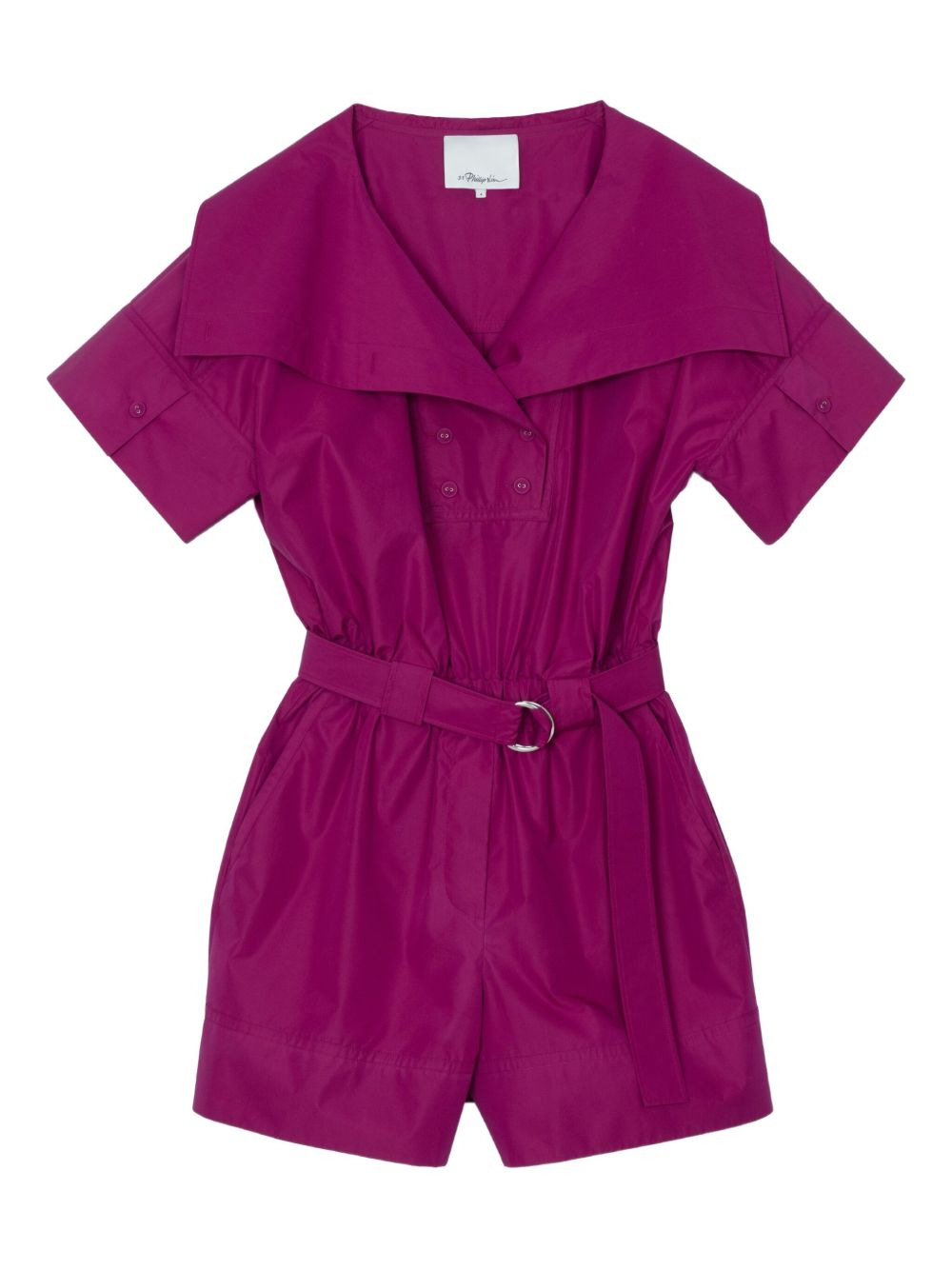 wide-collar belted jumpsuit Highlights - Dark pink - Wide collar - Short sleeves - Button detailing - Belted waist - Side pockets Imported Composition Cotton 70%, Polyester 30% Washing instructions Read Manufacturer Guidelines