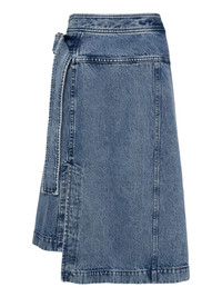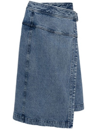 wrap-front denim skirt Highlights - Indigo blue - Cotton - Denim - Light washed - Wrap design - Belted waist - A-line - Side slit - Knee-length - Asymmetric hem Imported Composition Cotton 100% Washing instructions Machine Wash