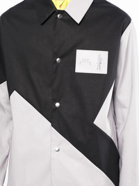 colour-block panelled shirt jacket black/grey cotton colour-block panelled design logo patch at the chest classic collar front button fastening long sleeves Made in United Kingdom Composition Cotton 100% SIZE & FIT Model measurements Height 6 ft 2 in(1.87 m) Bust/Chest 34.25 in(87 cm) Hips 36.22 in(92 cm) Waist 29.52 in(75 cm) FittingInformation This piece fits true to size. We recommend you get your regular size Cut for a loose fit Made with a mid-weight non-stretch fabric Washing instructions Dry Clean Only