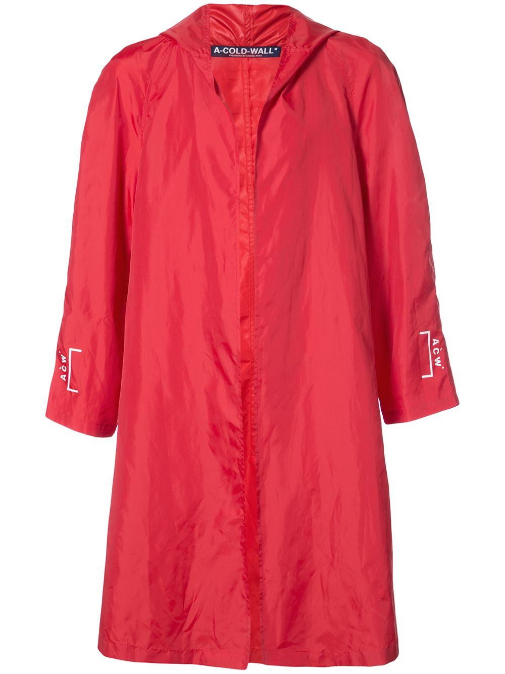 hooded raincoat Red hooded raincoat from A-COLD-WALL* featuring an open front, long sleeves, a printed logo, a straight hem and a back slit at the hem. Made in United Kingdom Composition Nylon 100% SIZE & FIT Model measurements Height 6 ft 1 in(1.85 m) Bust/Chest 33.85 in(86 cm) Hips 31.88 in(81 cm) Waist 29.92 in(76 cm) Washing instructions Machine Wash