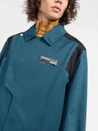 logo-badge longline trench coat teal/black cotton spread collar badge detailing concealed front button fastening shift style central rear vent Made in United Kingdom Composition Cotton 100% SIZE & FIT Model measurements Height 6 ft 2 in(1.87 m) Bust/Chest 36.61 in(93 cm) Hips 35.03 in(89 cm) Waist 27.95 in(71 cm) FittingInformation This piece fits true to size. We recommend you get your regular size Cut for a loose fit Made with a mid-weight non-stretch fabric Washing instructions Dry Clean Only