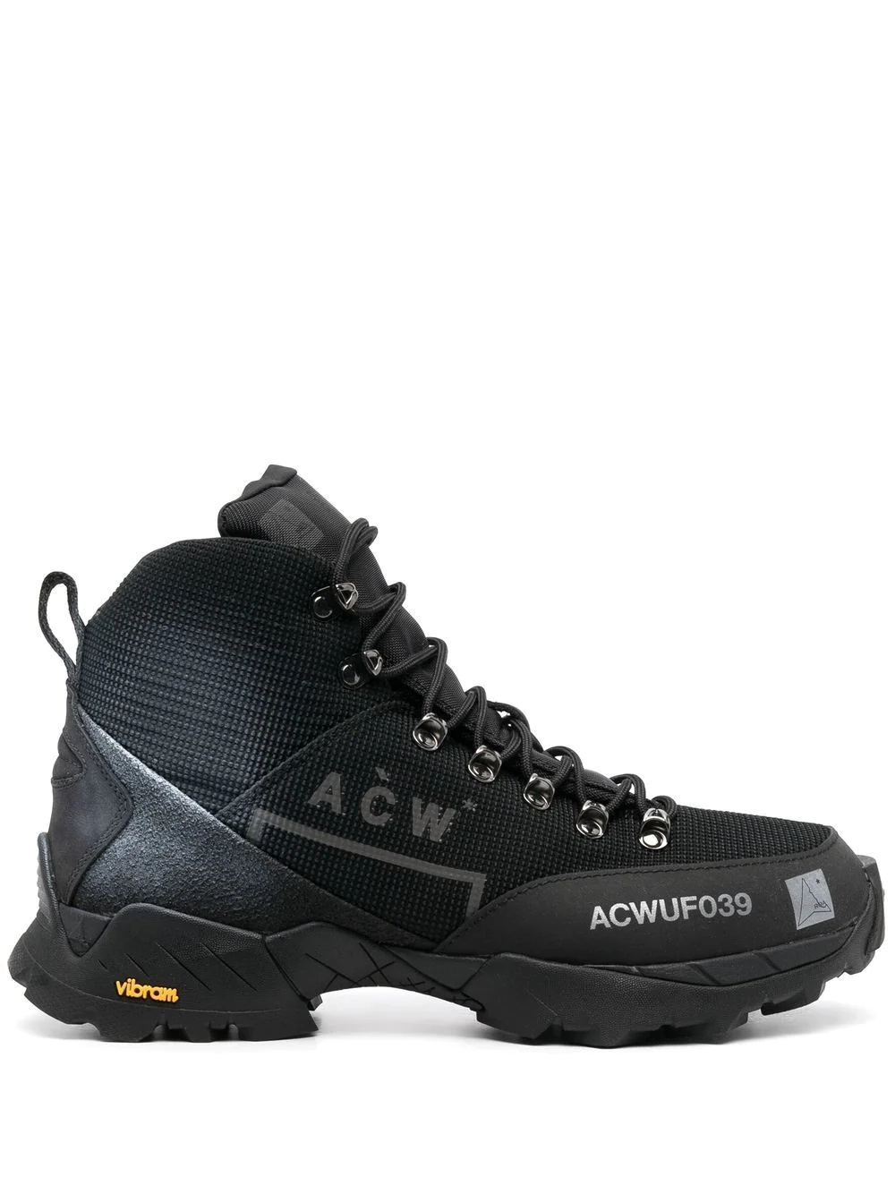 logo-print mesh high-top sneakers black leather mesh detailing logo print to the side ridged rubber sole pull-tab at the heel front lace-up fastening round toe Made in United Kingdom Composition Outer: Polyester 100%, Calf Leather 100% Sole: Rubber 100% Lining: Fabric 100% SIZE & FIT Measurement HEEL 1.77 in(4.5 cm) HEIGHT 4.33 in(11 cm) Sole height 1.18 in(3 cm)