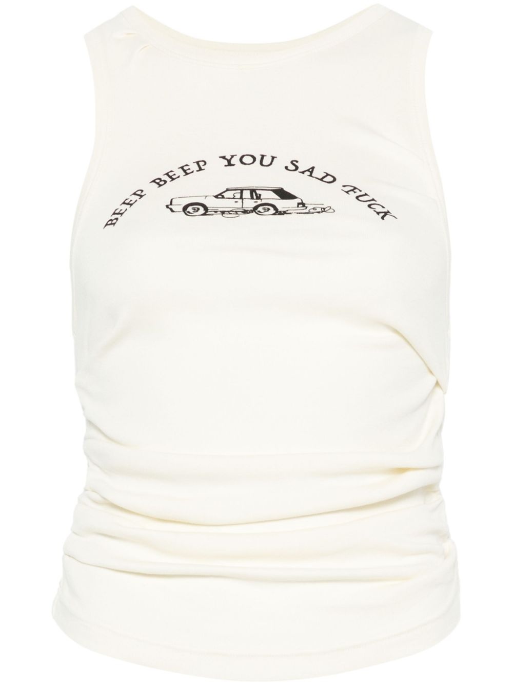 ruched tank top Highlights - Off-white - Organic cotton - Jersey texture - Ruched detailing - Crew neck - Sleeveless - Slogan print to the front - Illustration-style print - Embroidered logo to the rear - Straight hem - When buying this unisex item, keep in mind that it is graded in standard men's sizing. Imported Composition Organic Cotton 100% SIZE & FIT Measurement CHEST 22.83 in(58 cm) LENGTH 20.07 in(51 cm) Washing instructions Machine Wash