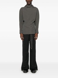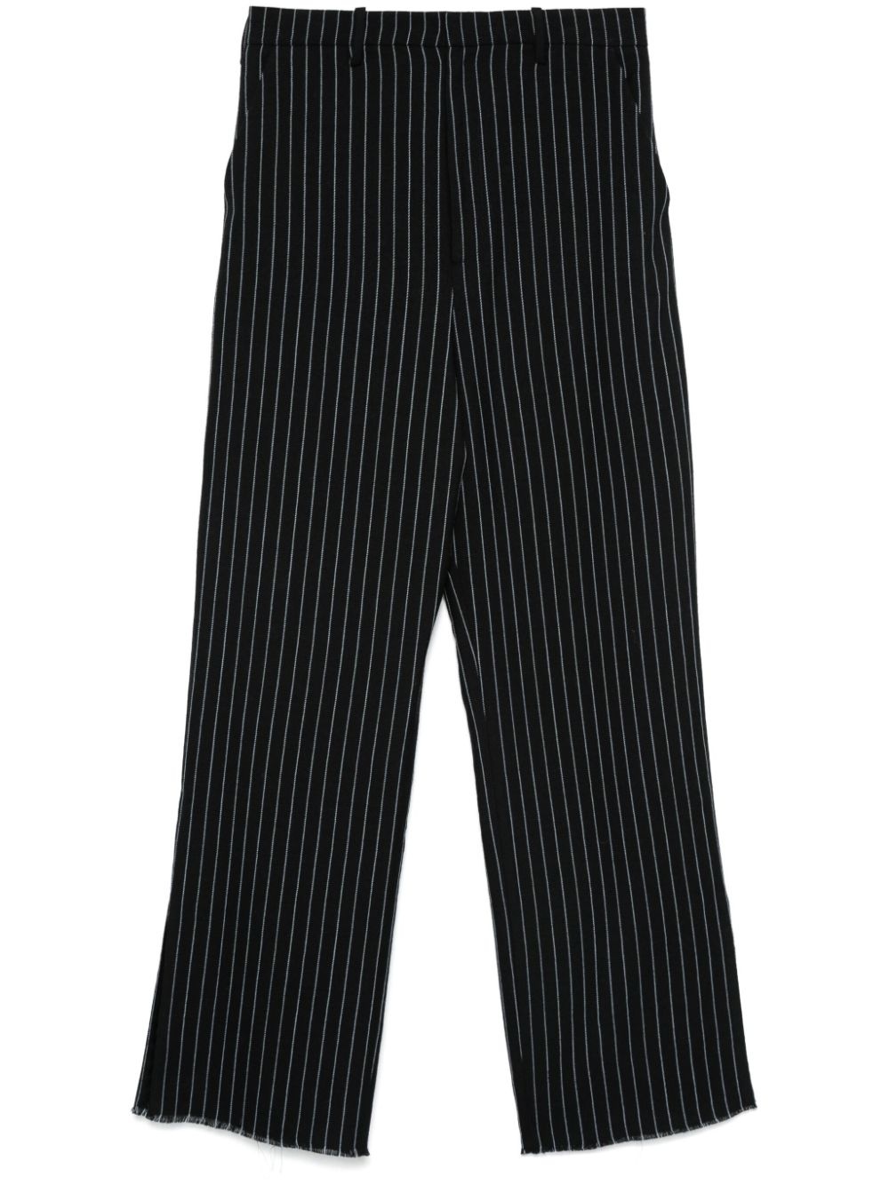 Trouble trousers Highlights - Black/light blue - Virgin wool blend - Interlock twill weave - Concealed front button, hook and zip fastening - Pinstripe pattern - Mid-rise - Belt loops - Two side slash pockets - Two rear button-fastening jetted pockets - Logo patch to the rear - Side slits - Split ankles - Frayed hem - Straight leg - When buying this unisex item, keep in mind that it is graded in standard men's sizing. Made in United Kingdom Composition Outer: Virgin Wool 82%, Viscose 18% Lining: Cupro 100% SIZE & FIT Model measurements Height 5 ft 11 in(1.8 m) Bust/Chest 31.49 in(80 cm) Hips 36.61 in(93 cm) Waist 24.4 in(62 cm) FittingInformation This unisex piece runs small and is designed with a straight-cut over the leg – take one size up Made from a midweight non-stretch fabric