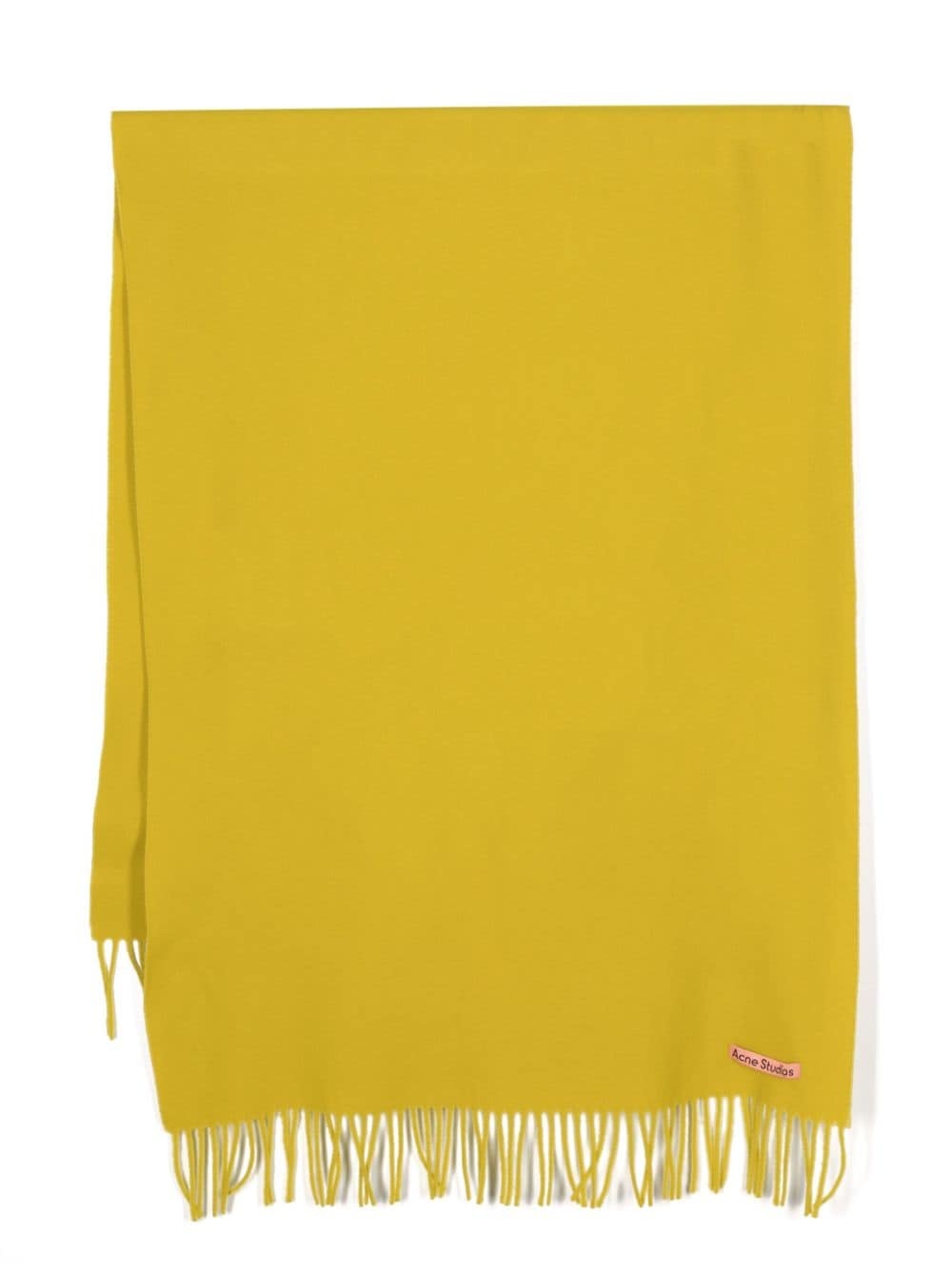 fringed-edge wool scarf Highlights - Mustard yellow - Wool - Mini logo tag - Fringed edge - Unisex Made in Italy Composition Wool 100% SIZE & FIT Measurement LENGTH 78.74 in(200 cm) WIDTH 27.55 in(70 cm) Washing instructions Dry Clean Only