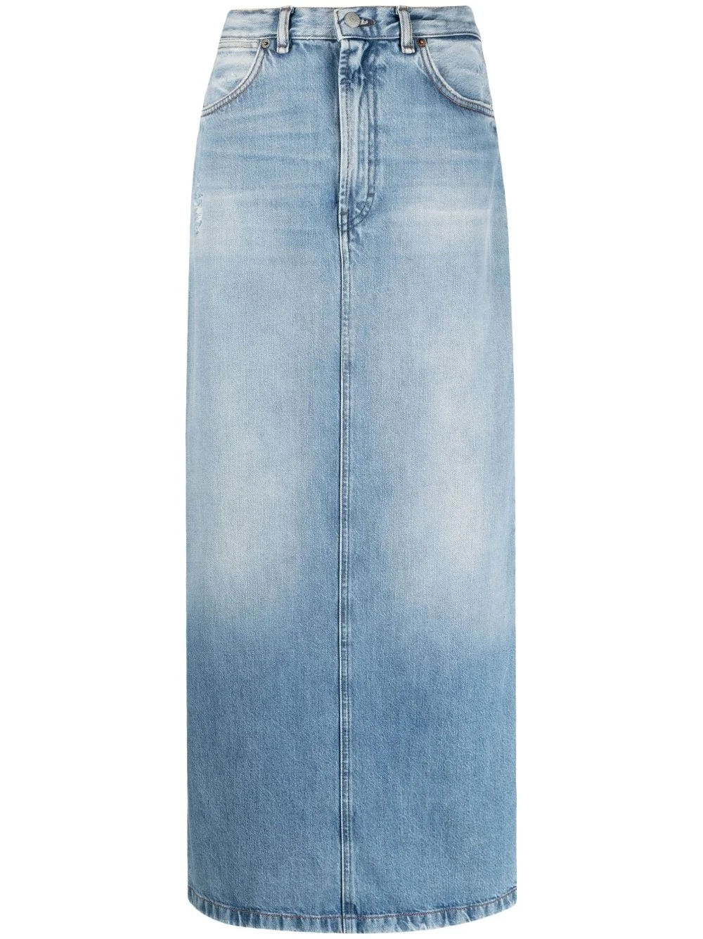 high-waisted denim maxi skirt Highlights - Light blue - Cotton - Washed denim - Whiskering effect - Logo patch to the rear - Concealed fly and button fastening - Classic five pockets - Central rear vent - Straight hem - Maxi Made in Italy Composition Cotton 100% SIZE & FIT Model measurements Height 5 ft 9 in(1.76 m) Bust/Chest 33.07 in(84 cm) Hips 34.64 in(88 cm) Waist 25.59 in(65 cm) FittingInformation This maxi-length skirt is intended to be worn just below the waist The vented hem offers movement at the rear Sturdy and hard-wearing, this denim piece offers no stretch This piece fits true to size – take your usual size Washing instructions Machine Wash