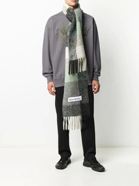 checked mohair-blend scarf Getting cold outside? No big deal. Take this cosy multi check scarf from Acne Studios and cover yourself. In style, we mean. Highlights - Green/grey/black - Alpaca-wool-mohair blend - Check pattern - Fringed edge - Logo patch to the rear Made in Italy Composition Alpaca 33%, Wool 25%, Polyamide 22%, Mohair 20% SIZE & FIT Model measurements Height 6 ft 2 in(1.87 m) Bust/Chest 37.79 in(96 cm) Hips 37.79 in(96 cm) Waist 30.31 in(77 cm) Measurement LENGTH 98.42 in(250 cm) WIDTH 11.02 in(28 cm) Washing instructions Dry Clean Only