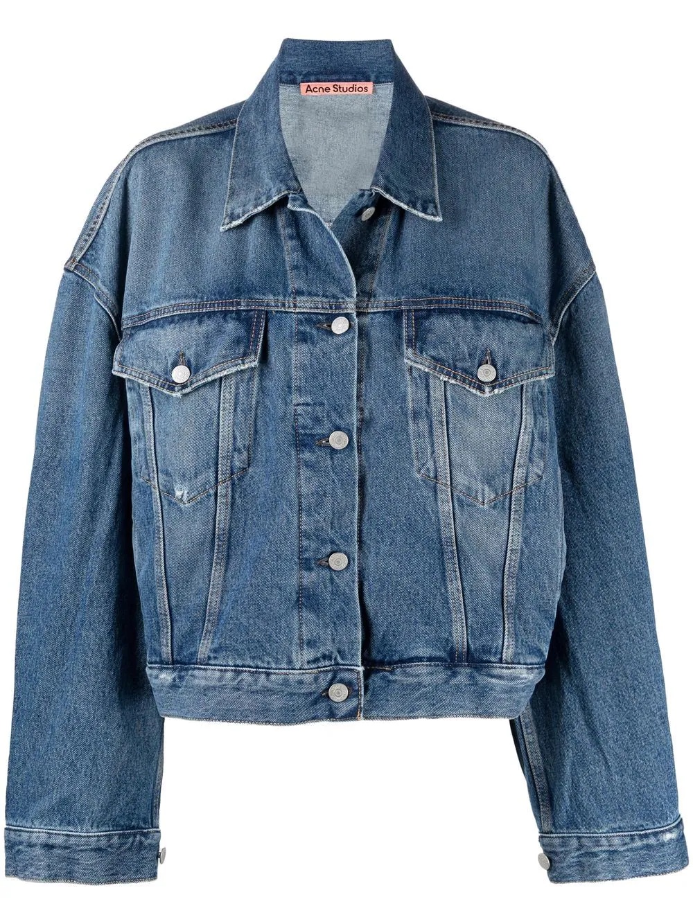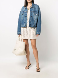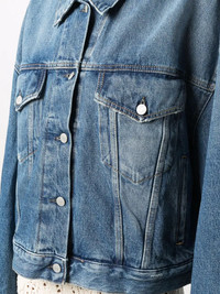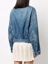cropped denim jacket Highlights - Blue - Organic cotton - Dark wash - Two front flap pockets - Front button fastening - Classic collar - Long sleeves - Buttoned cuffs - Straight hem Made in Italy Composition Cotton 100% SIZE & FIT Model measurements Height 5 ft 11 in(1.8 m) Bust/Chest 33.07 in(84 cm) Hips 37.4 in(95 cm) Waist 25.19 in(64 cm) Measurement BUST 55.9 in(142 cm) LENGTH 23.62 in(60 cm) Shoulder Width 25.98 in(66 cm) SLEEVE LENGTH 35.43 in(90 cm) FittingInformation This piece fits true to size. We recommend you get your regular size Cut for an oversized fit Made with a mid-weight non-stretch fabric Washing instructions Machine Wash