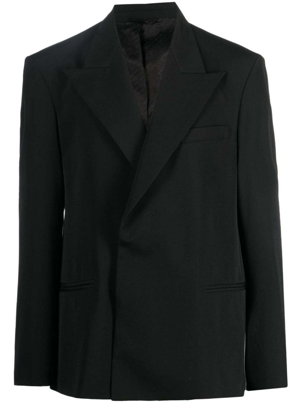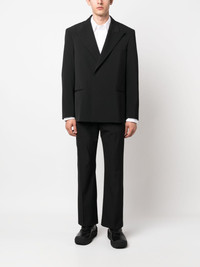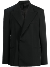 peak-lapel double-breasted blazer black peak lapels concealed front fastening long sleeves shoulder pads straight hem chest welt pocket two front welt pockets Imported Composition Lining: Viscose 50%, Acetate 50% Outer: Polyester 55%, Wool 45% SIZE & FIT Model measurements Height 6 ft 2 in(1.87 m) Bust/Chest 36.41 in(92.5 cm) Hips 35.43 in(90 cm) Waist 29.52 in(75 cm) FittingInformation Designed to be unstructured, offering a loose fit throughout Made from a midweight non-stretch fabric This piece fits true to size – take your usual size