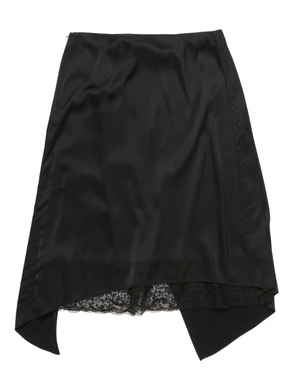 ruffled lace-trim midi skirt Highlights - Black - Satin - Asymmetrical hem - Ruffled overlay - Lace trim Imported Composition Viscose 97%, Elastane 3% Washing instructions Read Manufacturer Guidelines
