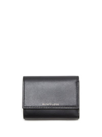 tri-fold leather wallet Highlights - Black - Calf leather - Concealed press-stud fastening - Tri-fold design - Logo lettering - Rear stud-fastening pocket - Internal note compartment - Internal card slots - Debossed internal logo Made in Italy Composition Outer: Calf Leather 100% Lining: Calf Leather 100% SIZE & FIT Measurement DEPTH 1.18 in(3 cm) LENGTH 3.81 in(9.7 cm) WIDTH 2.95 in(7.5 cm)