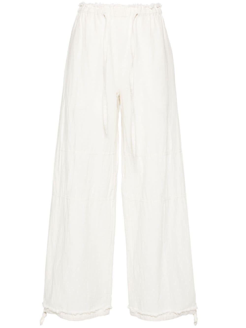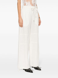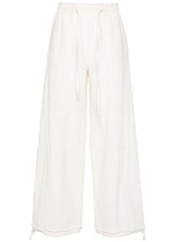 wide-leg trousers Highlights - White - Cotton-linen blend - Elasticated drawstring waistband - Two side slit pockets - Seam detailing - Drawstring ankles - Rear patch pocket Imported Composition Cotton 63%, Linen/Flax 37% SIZE & FIT Model measurements Height 5 ft 9 in(1.76 m) Bust/Chest 31.88 in(81 cm) Hips 35.43 in(90 cm) Waist 24.8 in(63 cm) FittingInformation Designed with a wide-leg cut, these trousers allow for a close fit at the waist and offer a loose and roomy fit over the leg The elasticated waist allows for a comfortable fit Made from a lightweight non-stretch fabric This piece fits true to size – take your usual size Washing instructions Dry Clean Only