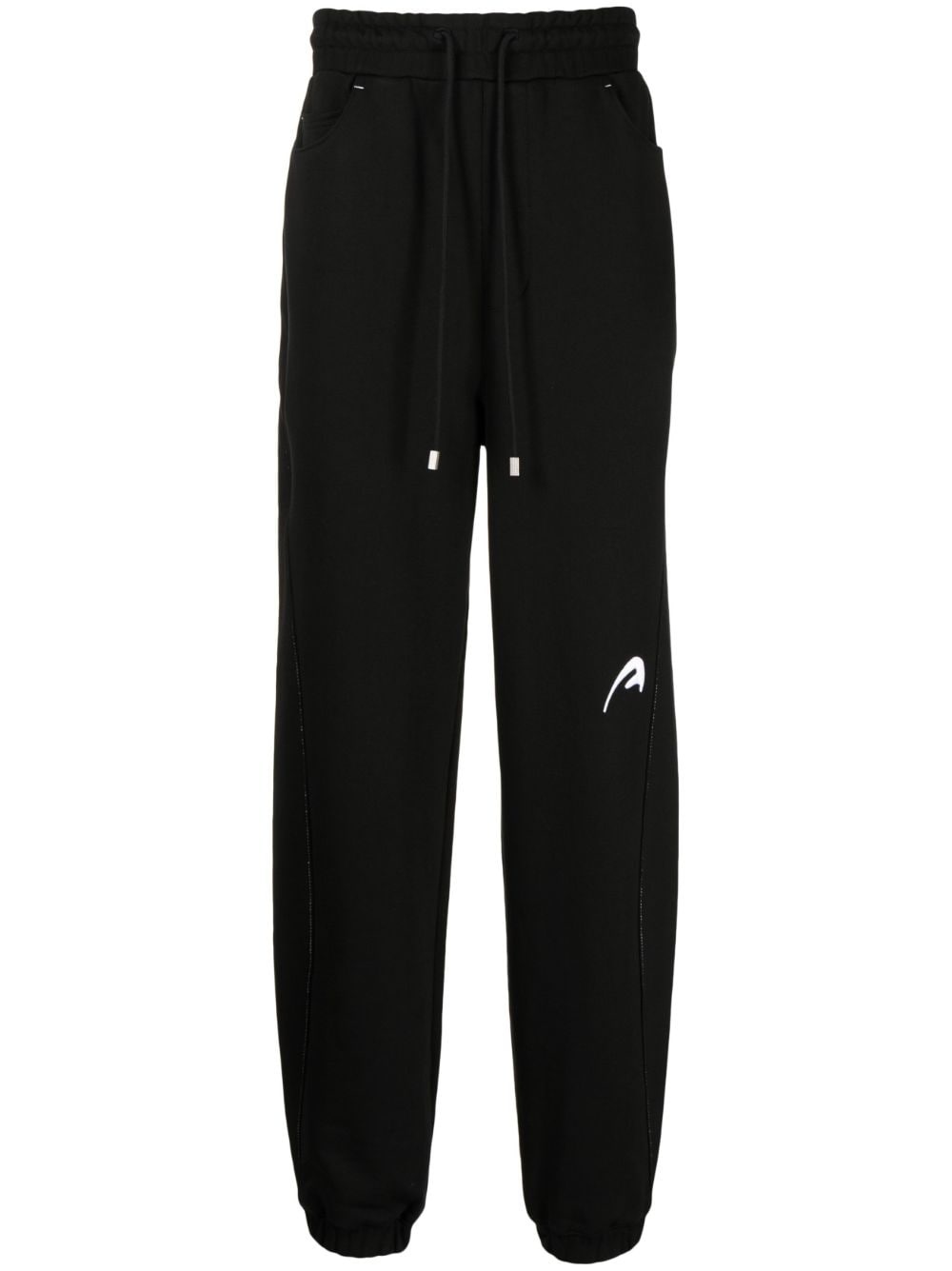 logo-embroidered cotton drawstring trousers Highlights - Black - Cotton - Jersey texture - Embroidered logo at the leg - Seam detailing - Elasticated drawstring waistband - Wide leg - Two side inset pockets - Two rear flap pockets - Elasticated ankles Imported Composition Cotton 100% SIZE & FIT Model measurements Height 6 ft 2 in(1.87 m) Bust/Chest 34.25 in(87 cm) Hips 36.22 in(92 cm) Waist 29.52 in(75 cm) FittingInformation Designed for a relaxed tapered leg, allowing a comfortable loose fit above the knee with a closer fit towards the calves The elasticated waist allows for a comfortable fit Made from a midweight non-stretch fabric This piece fits true to size – take your usual size Washing instructions Hand Wash