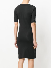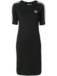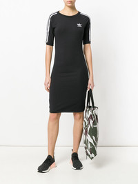 Adidas Originals 3-Stripes dress With a focus on endless innovation, Adidas continues to inspire consumers to harness the power of sport. Deeply rooted in the company ethos is the concept of ‘creating the new’ and through collaborations with Stella McCartney and Yohji Yamamoto the label continues to reach new audiences across fashion, lifestyle and sports. This black cotton blend Adidas Originals 3-Stripes T-shirt dress features a round neck, short sleeves, a signature three stripe detail, an embroidered designer logo to the chest, a fitted silhouette and a knee length. Imported Composition Cotton 93%, Spandex/Elastane 7% SIZE & FIT Model measurements Height 5 ft 10 in(1.77 m) Bust/Chest 32.28 in(82 cm) Hips 35.82 in(91 cm) Waist 24.8 in(63 cm) Washing instructions Machine Wash