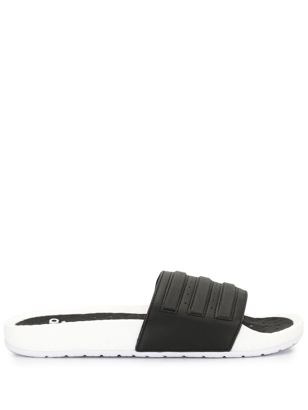Adilette Boost slides Black Adilette Boost sandals from adidas featuring a slip-on style, an open toe, a flat sole, a signature three stripe detail and a branded insole. Imported Composition Outer: Fabric 100% Lining: Fabric 100% Sole: Fabric 100%