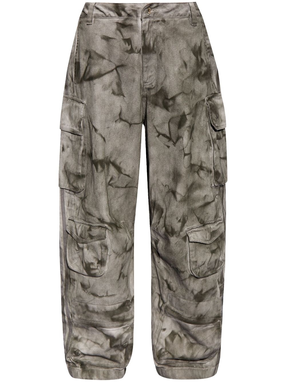 camouflage-print cargo trousers Highlights - Grey - Cotton - Camouflage print - Concealed fly and button fastening - Signature 3-stripes logo - Applique logo - Belt loops - Two side inset pockets - Multiple cargo pockets - High-waisted - Wide leg Imported Composition Cotton 100%