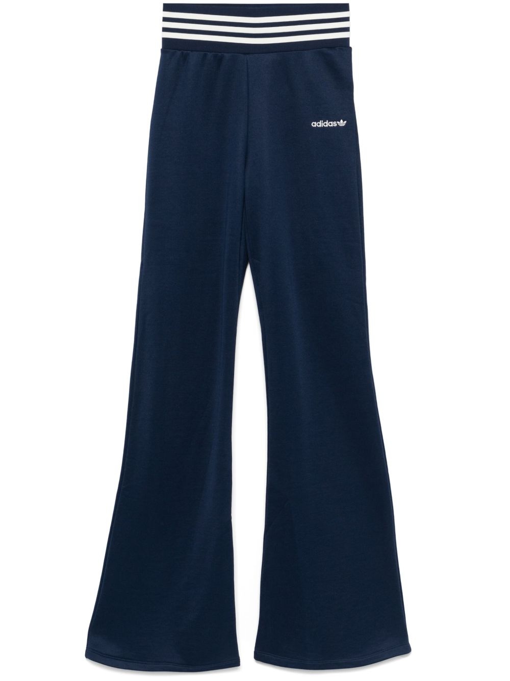 flared track pants Highlights - Navy blue - Elasticated waistband - Signature 3-stripes logo - Embroidered logo at the leg Imported Composition Recycled Cotton 56%, Recycled Polyester 44% SIZE & FIT Model measurements Height 5 ft 9 in(1.75 m) Bust/Chest 34.64 in(88 cm) Hips 36.61 in(93 cm) Waist 26.37 in(67 cm) FittingInformation Designed with a flared hem, these trousers allow for a close fit at the waist with a slim fit over the leg and widening towards the hem The elasticated waist allows for a comfortable fit Made from a midweight non-stretch fabric, this piece offers minimal elasticity when worn