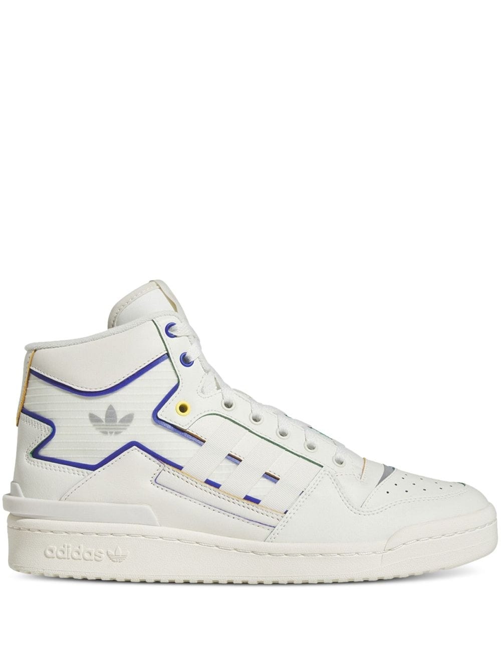 Forum Exhibit Mid "Blue" sneakers Highlights - Off-white - Faux leather - Front lace-up fastening - Reflective detailing - Signature trefoil logo detail - Logo patch at the tongue - Signature 3-stripes logo - Perforated toebox - Round toe - Padded ankle - Branded insole - Logo at the sole - Rubber outsole - These styles are supplied by a premium and authenticated sneaker marketplace. stocking only the most sought-after footwear, they source and curate some of the most hard to find sneakers from around the world. Imported Composition Sole: Rubber 100% Lining: Fabric 100% Outer: Artificial Leather 100%