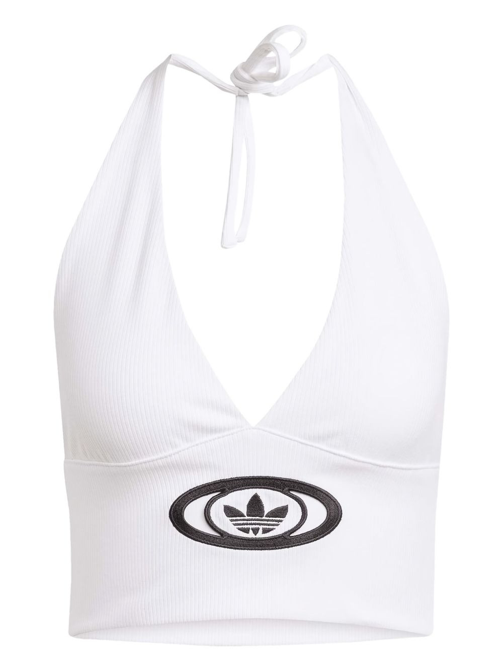 halterneck ribbed tank top Highlights - White - Ribbed fabric - Halterneck - Tie fastening - Oval logo emblem Imported Composition Viscose 47%, Cotton 43%, Elastane 10% Washing instructions Read Manufacturer Guidelines