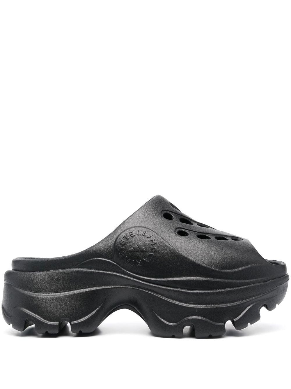 logo-embossed perforated slides adidas by Stella McCartney presents a modern twist on the classic clogs. Set atop a chunky platform sole, this open toe design is detailed with a perforated front strap and an embossed logo at the sides. Highlights - Black - Embossed logo to the side - Open toe - Perforated design - Slip-on style - Platform sole Imported Composition Outer: Rubber 100% Lining: Rubber 100% Sole: Rubber 100% SIZE & FIT FittingInformation This piece fits true to size – take your usual size
