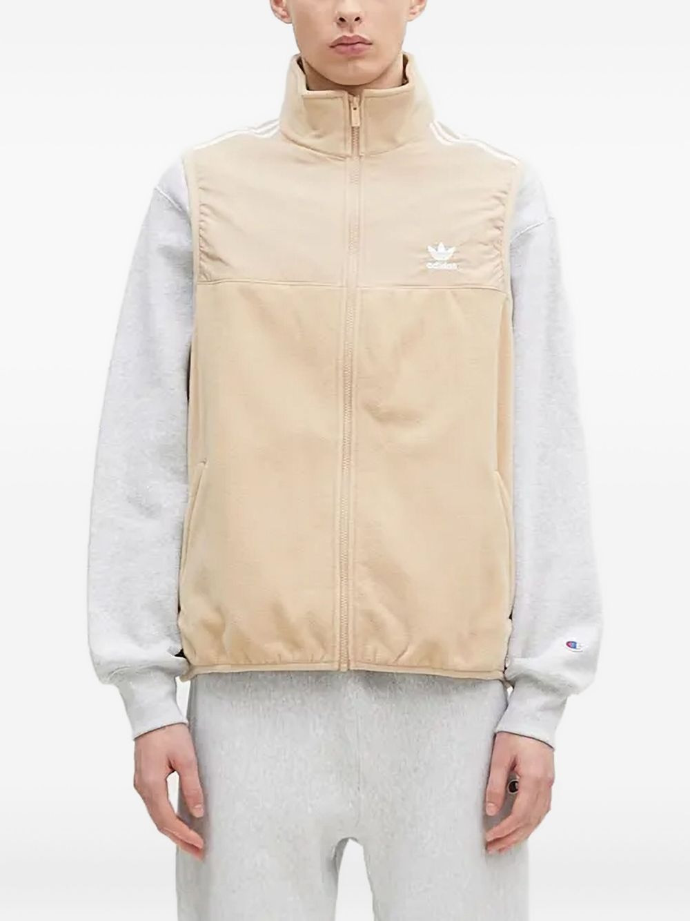 logo-embroidered vest Highlights - Beige - Fleece texture - Zip fastening - High neck - 3-stripes logo - Embroidered logo Imported Composition Recycled Polyester 100% Washing instructions Read Manufacturer Guidelines