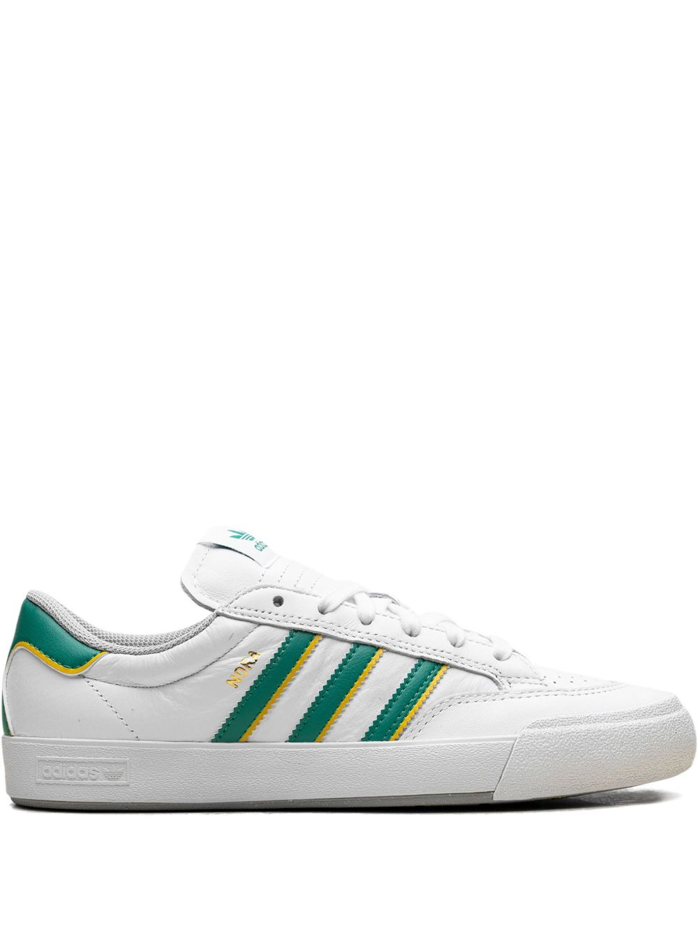 Nora three-stripe leather sneakers Highlights - White - Leather upper - Green stripes - Yellow stripe detail - Low-top design - Flat sole - These styles are supplied by a premium and authenticated sneaker marketplace. stocking only the most sought-after footwear, they source and curate some of the most hard to find sneakers from around the world. Imported Composition Rubber 100% Outer: Leather 100% Sole: Fabric 100%