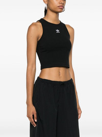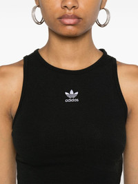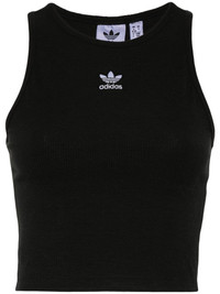 ribbed tank top Highlights - Black - Fine ribbed - Signature 3-stripes logo - Embroidered logo to the front - Round neck - Sleeveless - Racerback - Straight hem - Cropped Imported Composition Cotton 46%, Rayon 45%, Spandex/Elastane 9% Washing instructions Machine Wash