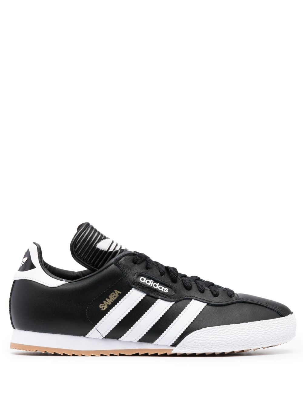 Samba Super low-top sneakers Highlights - Black - Calf leather - Signature monofilament side-stripe detail - Logo-print tongue - Branded heel counter - Almond toe - Front lace-up fastening - Branded insole - Flat rubber sole - Unisex Imported Composition Leather 100% SIZE & FIT Measurement HEEL 0.59 in(1.5 cm) Sole height 0.39 in(1 cm)