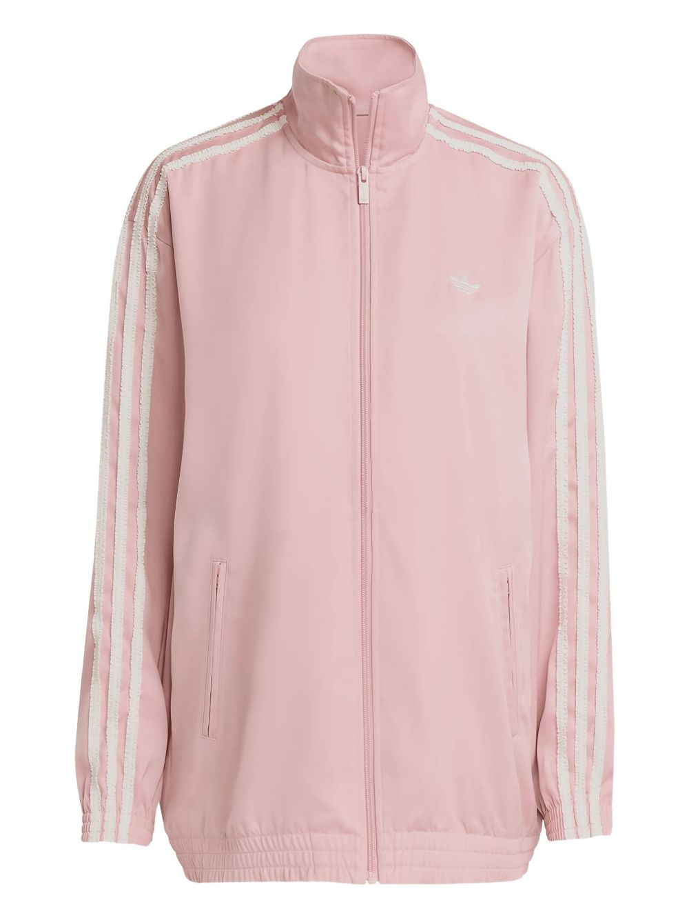 striped track jacket Highlights - Pink - Three-stripe detail - Frilled trim - Zip fastening - Turtleneck Imported Composition Recycled Polyester 97%, Elastane 3% Washing instructions Read Manufacturer Guidelines