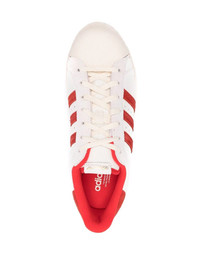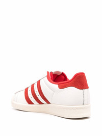 Superstar 82 "White" sneakers Highlights - White/red - Leather - Colour-block design - Signature 3-stripes logo - Suede panelling - Front lace-up fastening - Round toe - Rubber toecap - Logo patch at the tongue - Branded insole - Chunky rubber sole Imported Composition Leather 100%