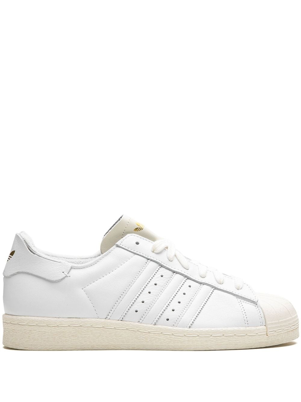 Superstar low-top sneakers Highlights - Off-white/white - Calf leather - Perforated detailing - Signature 3-stripes logo - Logo-print tongue - Round toe - Front lace-up fastening - Branded heel counter - Flat rubber sole Imported Composition Sole: Rubber 100% Outer: Leather 100% Lining: Leather 100% SIZE & FIT Measurement HEEL 1.18 in(3 cm) Sole height 0.98 in(2.5 cm)