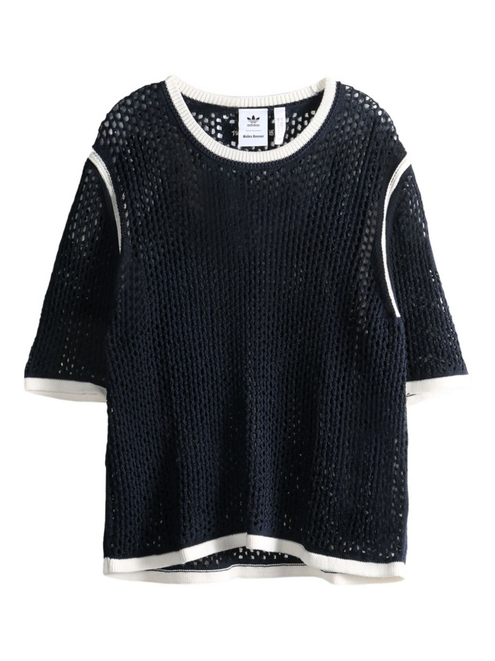 x Wales Bonner crochet T-shirt Highlights - Navy blue - Round neck - Short sleeves - Logo patch to the rear Imported Composition Cotton 60%, Recycled Polyester 40% Washing instructions Machine Wash