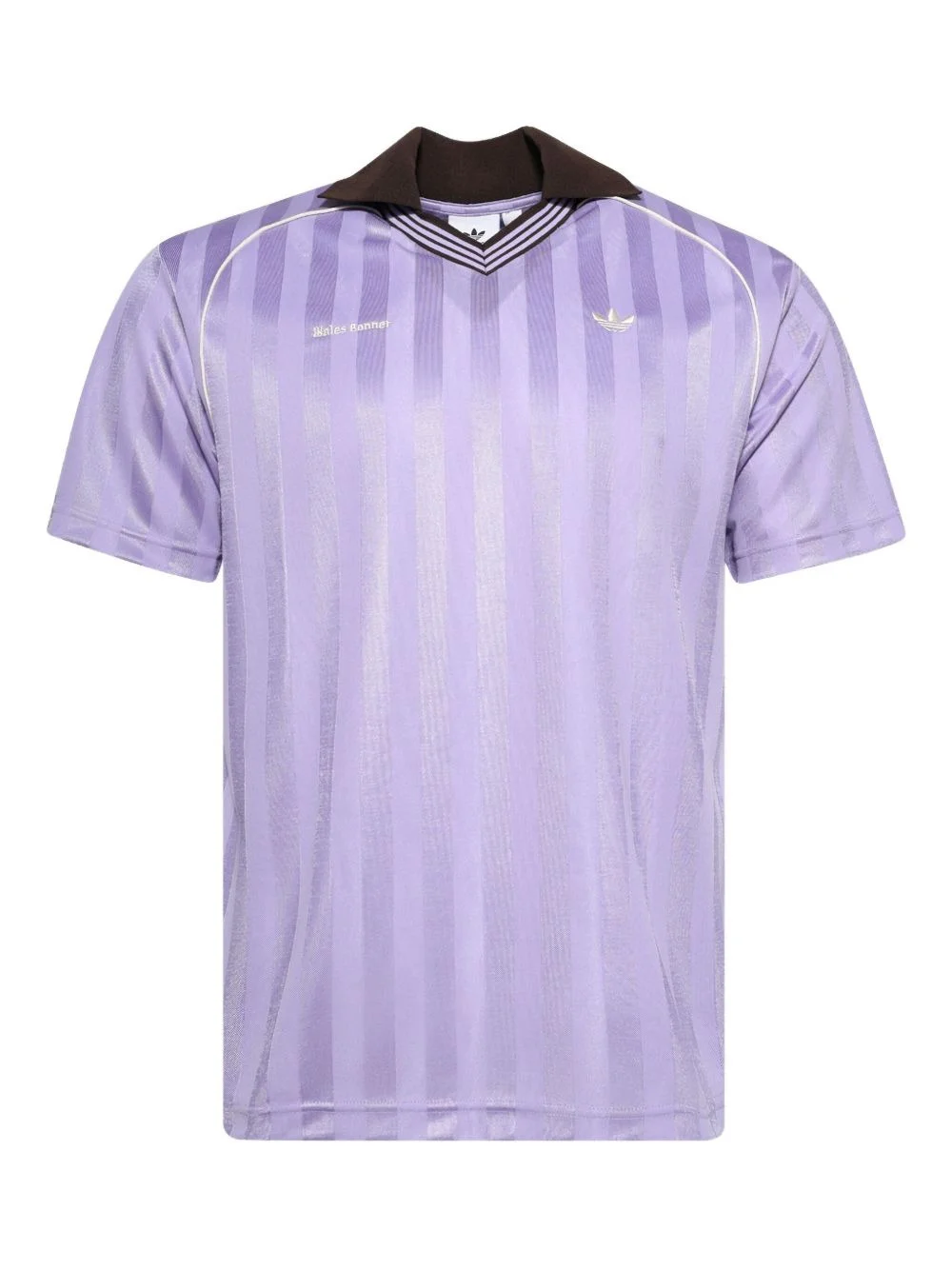 x Wales Bonner football T-shirt Highlights - Light purple - Stripe pattern - Spread collar - Short sleeves - Logo detail - V-neck Imported Composition Recycled Polyester 100% Washing instructions Read Manufacturer Guidelines
