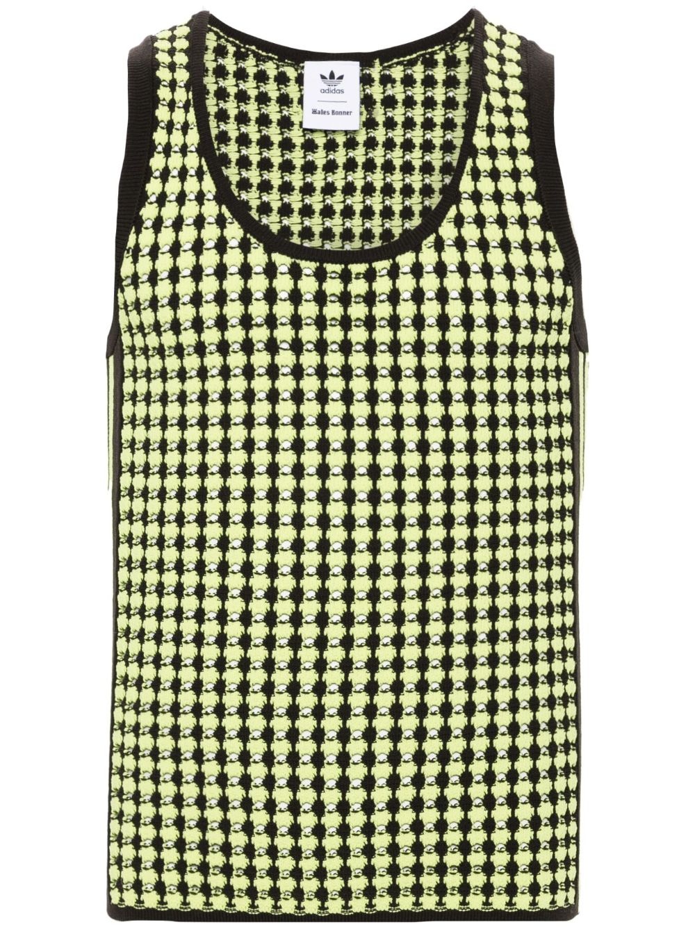 X Wales Bonner houndstooth crochet-knit vest Highlights - Cedar brown/neon green - Recycled polyester - Knitted construction - Crochet knit - Houndstooth pattern - Round neck - Sleeveless - Signature 3-stripes logo - Straight hem - When buying this unisex item, keep in mind that it is graded in standard men's sizing. Imported Composition Recycled Polyester 100% SIZE & FIT Model measurements Height 6 ft 2 in(1.87 m) Bust/Chest 36.41 in(92.5 cm) Hips 35.43 in(90 cm) Waist 29.52 in(75 cm) FittingInformation This unisex piece is designed for a relaxed fit whether you usually select women's or men's sizes Made with a midweight knit, this piece offers some stretch