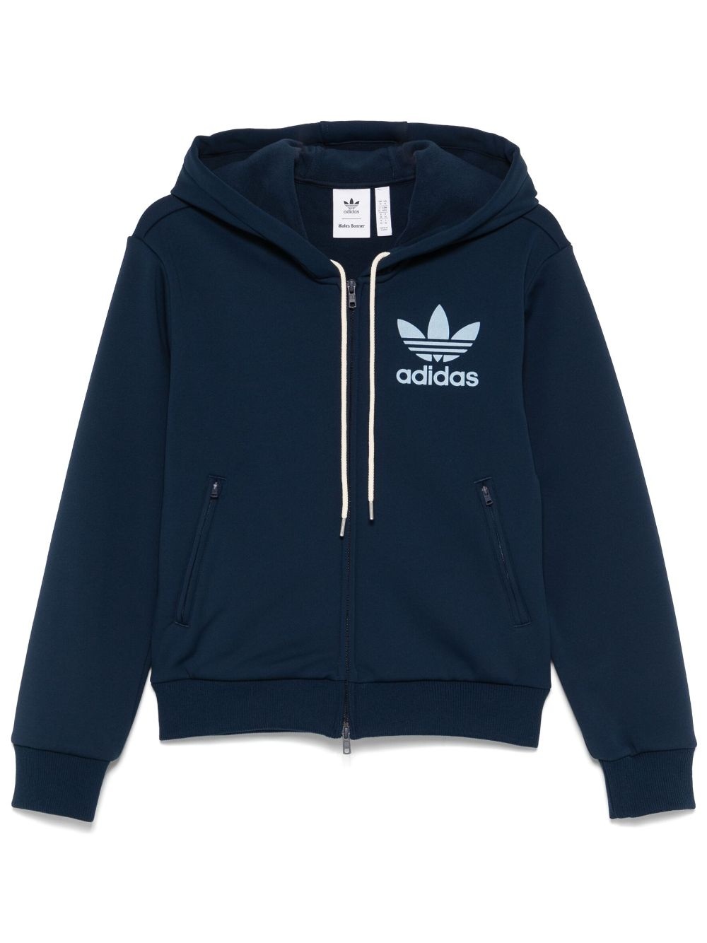 x Wales Bonner logo-flocked hoodie Highlights - Navy blue - Recycled polyester - Soft scuba jersey - Front two-way zip fastening - Drawstring hood - Logo-embroidered to the hood - Flocked logo - Long sleeves - Ribbed cuffs and hem - Two side zip-fastening pockets - Fleece lining - When buying this unisex item, keep in mind that it is graded in standard men's sizing. Imported Composition Outer: Recycled Polyester 100% Lining: Cotton 100% SIZE & FIT Model measurements Height 5 ft 11 in(1.8 m) Bust/Chest 32.67 in(83 cm) Hips 36.22 in(92 cm) Waist 24.4 in(62 cm) FittingInformation This piece is unisex – expect a slim fit if you usually select men's sizing; expect a looser fit if you usually select women's sizes The ribbed hem offers a close, comfortable fit Made from a midweight non-stretch fabric, this piece offers minimal elasticity when worn